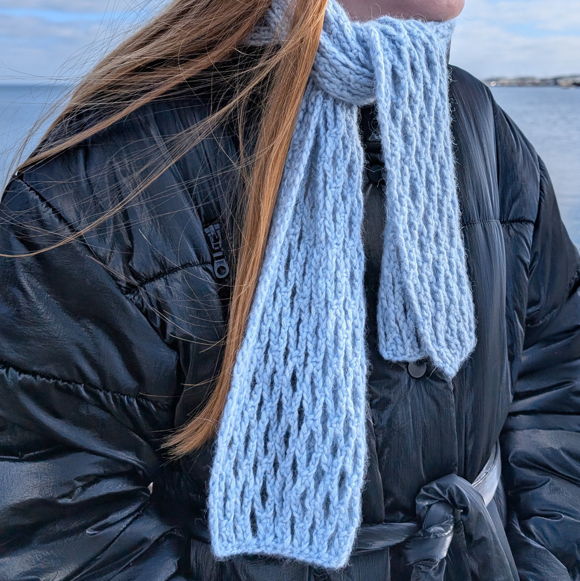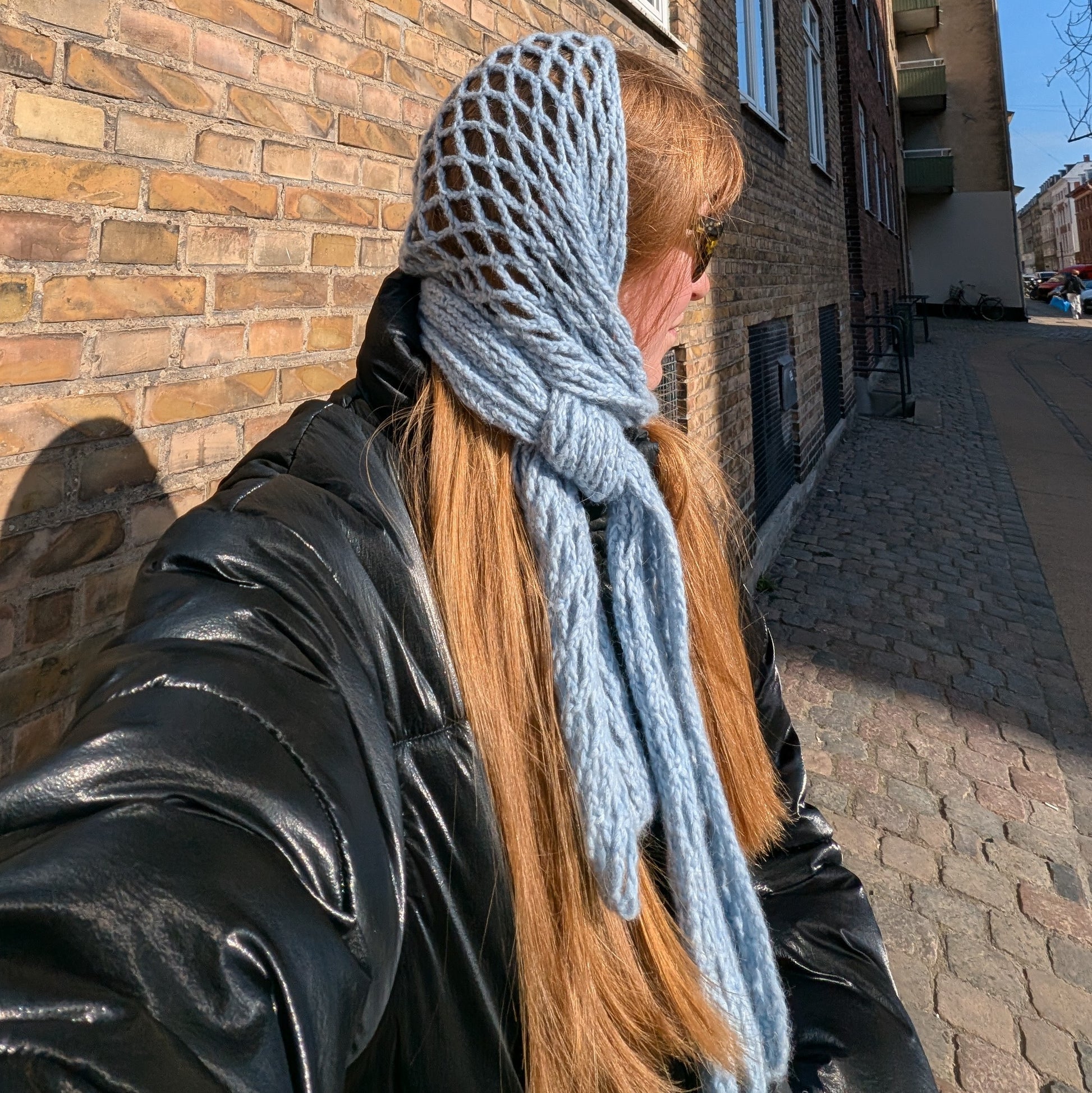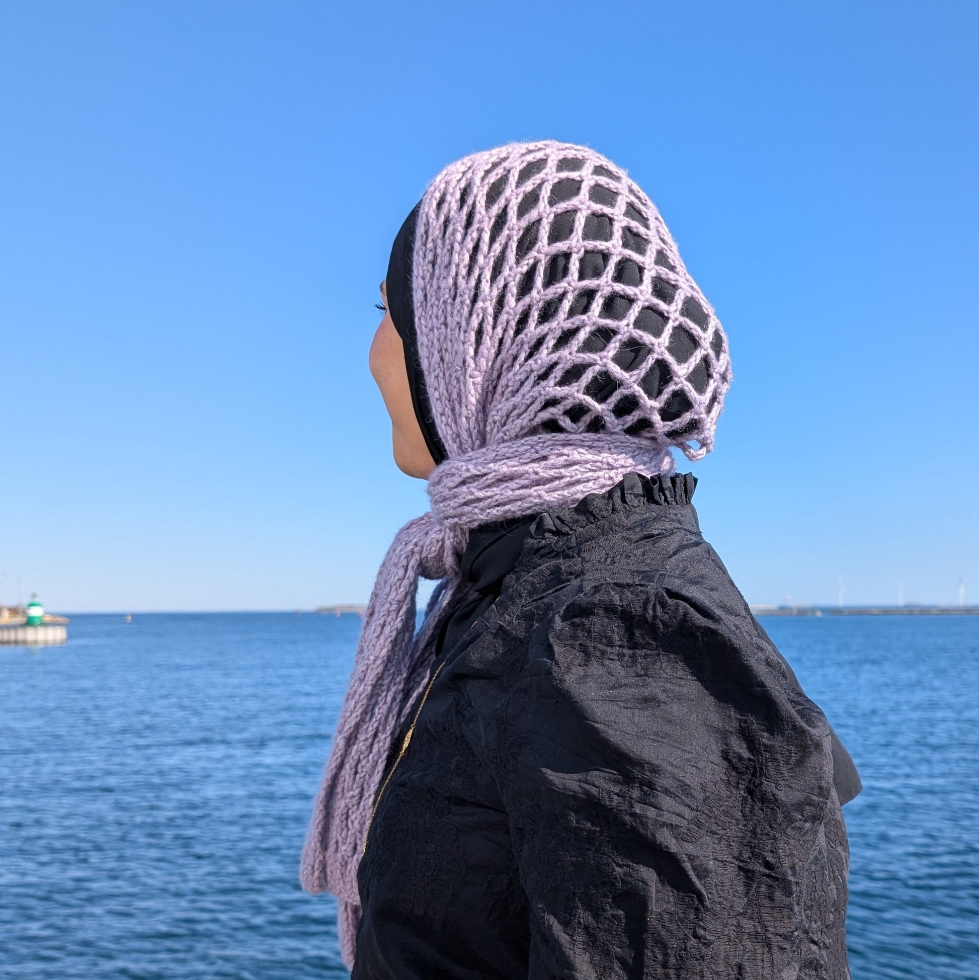 The Holey Hood is a light scarf crocheted as a lattice to function both as a scarf with the lattice relaxed/flat and as a hooded scarf with the lattice stretched out/opened around the head. The scarf has a retro vibe with the lattice pattern and the narrow drape. If you wish for the hood to stays very securely in place, you can either fasten it with a pin or make it wider by adding more rows. The pattern is beginner friendly and include video instructions.